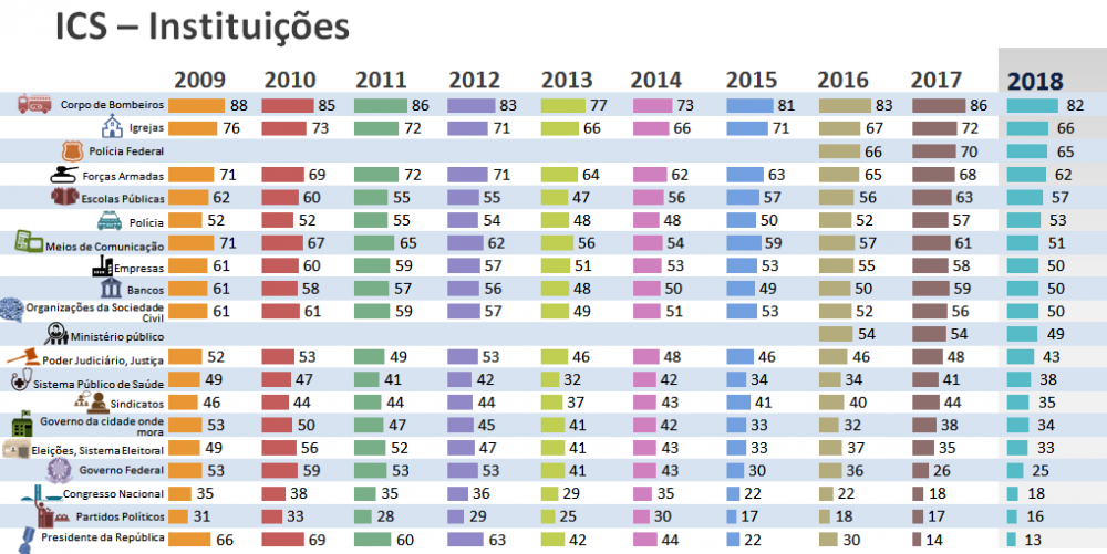Em 10 anos, nunca foi tão baixa a confiança do brasileiro nas instituições pesquisadas, o que aponta, de uma forma geral, que as instituições brasileiras perderam a confiança da população. Mesmo assim, o Corpo de Bombeiros permanece no topo do ranking, com um decréscimo de 4 pontos se comparado ao ICS do ano anterior.